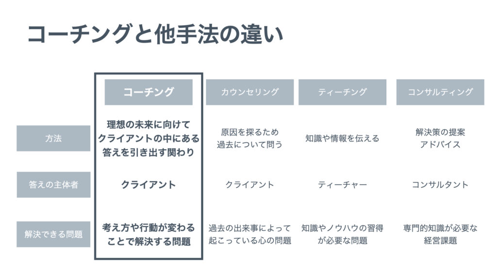 コーチは「答えはクライアントの中にある」という原則のもと関わっていきます。
